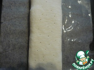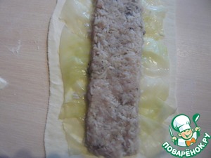 Тесто раскатываем примерно до 0,5 см. Выкладываем на него отваренную капусту. Причем, капуста может быть не целым листочком, а порванным. Главное нужно закрыть всю поверхность теста, оставив небольшие края для защипывания нашего рулета.