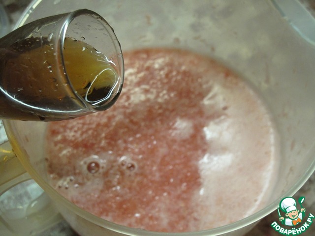 Добавить десертное вино. Желатин слегка разогреть до жидкого состояния, добавить к грейпфрутовому пюре и слегка взбить венчиком. Удалите образовавшуюся пенку.