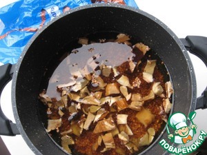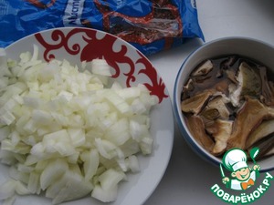 Белые сухие грибы замочить в кипятке, достать, мелко порезать. Большую луковицу почистить, порезать кубиком. Настой от грибов отстоять.