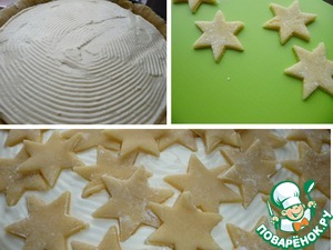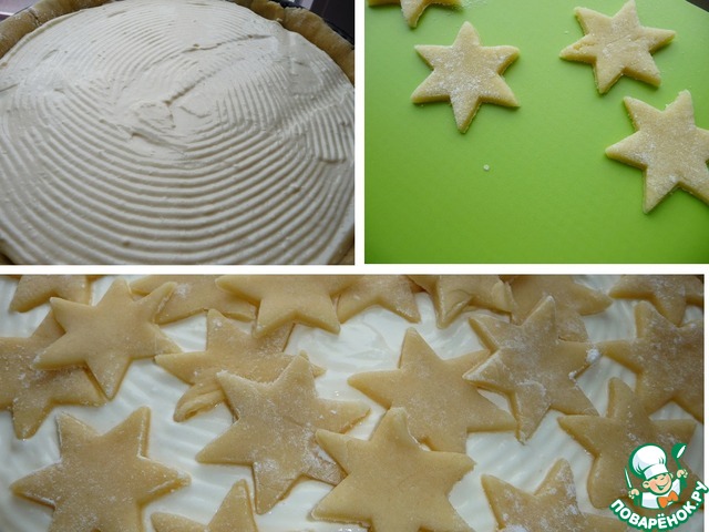 • Разровнять. Из другой части теста, вырубками для печенья, нарезать формочки любые. Можно просто нарезать ленточки.