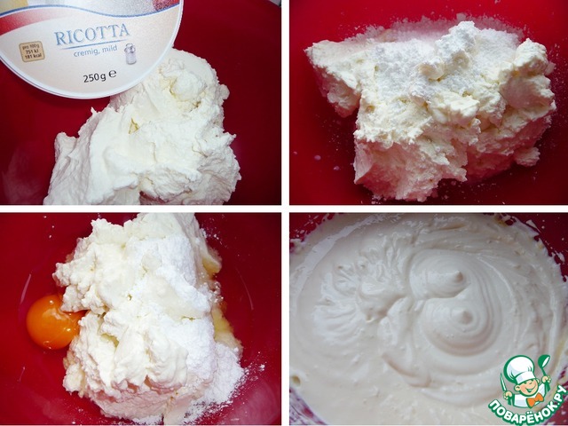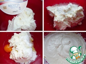 • Рикотту смешать с сахарной пудрой, добавить яйцо, яичный белок, хорошо перемешать (я взбила).
