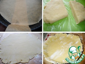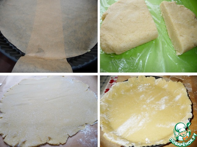 Тесто разделить на две неравные части. Большую часть теста раскатать в муке на пекарской бумаге, перенести в форму. Излишки теста обрезать.