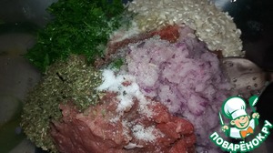 Фарш перемешать с рисом, пюрированным луком, зеленью, солью и перцем. Оставить на 30 мин отдохнуть.