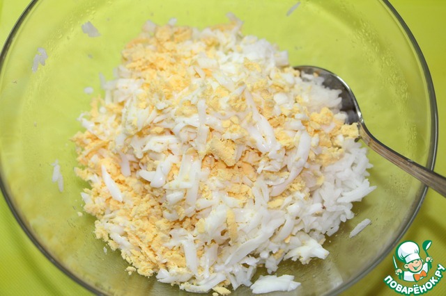 • Варёные яйца натереть на тёрке и отправить к рису, добавить сметану. Перемешать. Это основа наших "игрушек".