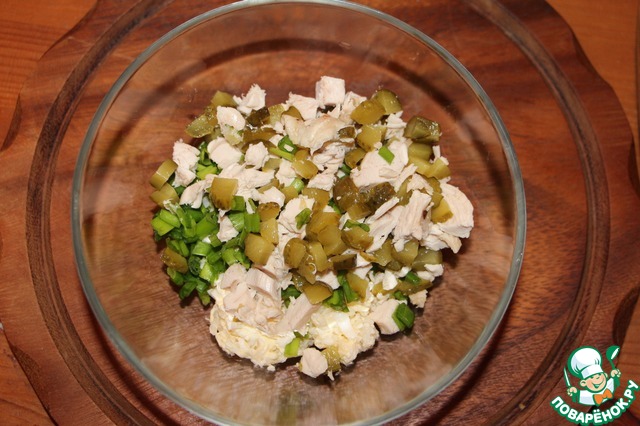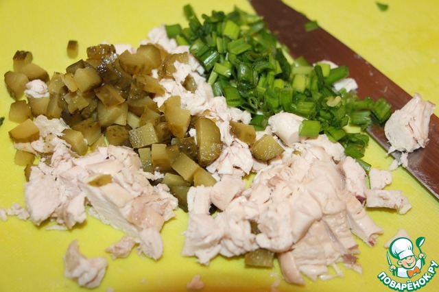 • Для куриной начинки измельчить зелёный лук, куриное мясо и маринованные огурцы нарезать мелкими кубиками