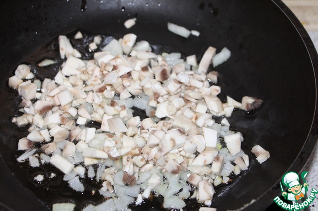 • Добавить мелко нарезанные шампиньоны, обжаривать не более 4-5 минут на большом огне, постоянно помешивая.