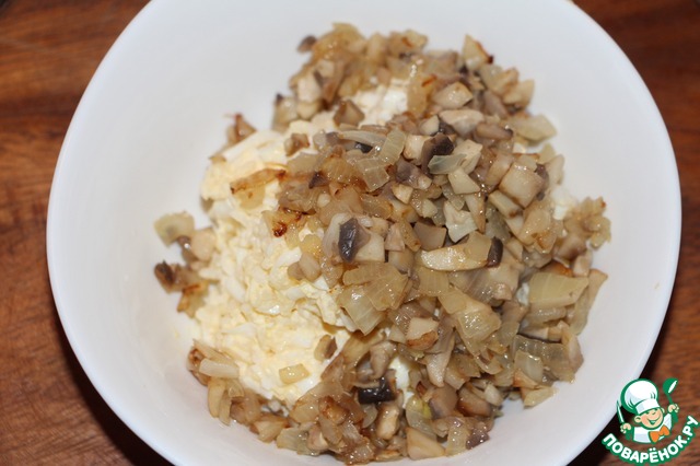 • Грибную смесь выложить на салфетку для удаления излишков масла. Добавить грибы ко второй части рисовой основы, добавить соль, перец, если нужно - ещё сметаны, но в эту закуску ее почти не требуется добавлять.