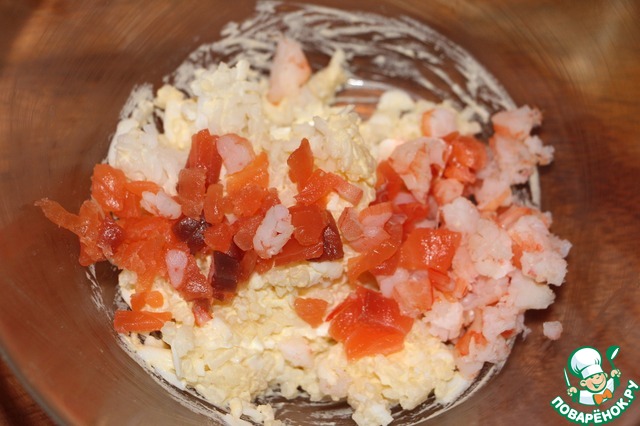 • Отварные креветки и ломтик малосольной красной рыбы нарезать кубиками