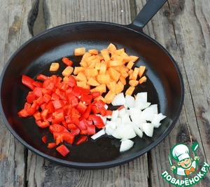На масле поджарьте слегка нарезанные лук, морковь и болгарский перец