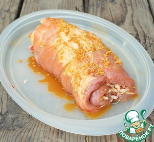 Обвяжите рулет плотно кулинарной нитью и обмажьте остатками горчичного маринада -