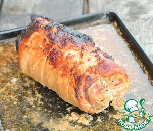 Нагрейте духовку до 160 градусов. Запекайте около 1-1,5 часов, желательно с конвекцией. На противень, на котором запекается рулет постоянно подливайте горячую воду, чтобы на поверхности противня было воды не менее 0,5 см. Периодически поливайте рулет образовавшимся соком.