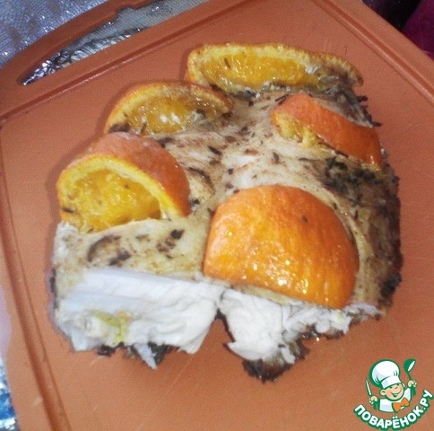 3. Порезать мандарин на полукольца, и уже промаринованную грудку начинить ими, предварительно сделав надрезы. Обернуть в два слоя фольги, запекать 45-50 минут при 180-200 градусах.