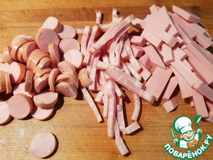 Тем временем произвольно нарезаем наши мясные продукты.