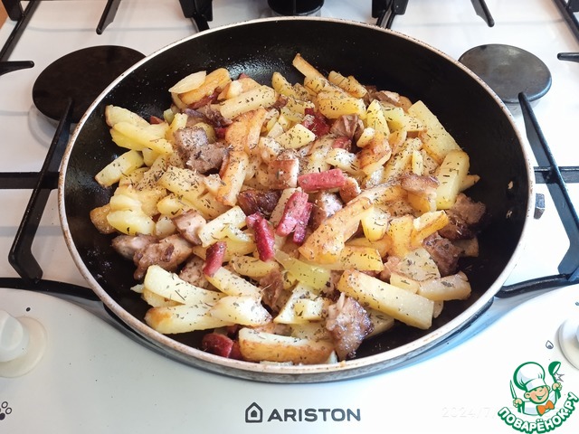 Перекладываем колбасу в картофель, перемешиваем и обжариваем еще минут 5. Уцхо-сунели рассыпаем по всей картошке, выдавливаем чеснок, быстро все перемешиваем и снимаем с огня. Даем постоять минутку, другую. Раскладываем по тарелкам и подаем к столу.