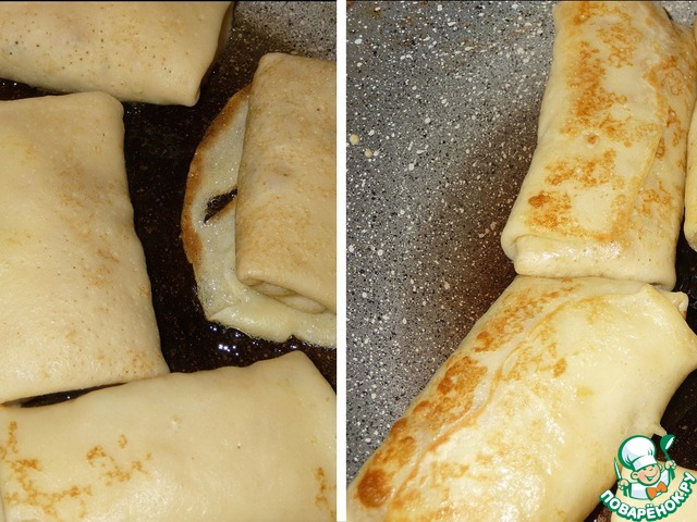 Блины обжарить на среднем огне в смеси растительного и топленого масла с двух сторон.