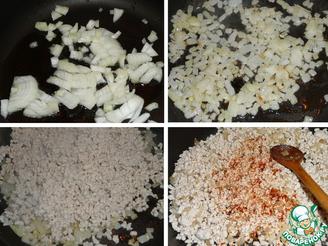 Добавить фарш, настало время посолить, поперчить по вкусу. -