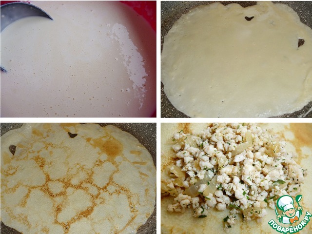 Выпекаю первую сторону блина до готовности, переворачиваю и слегка подсушиваю вторую сторону. Блин переношу на тарелку, выкладываю начинку на хорошо обжаренную сторону блина.