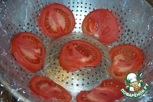 Два помидора нарезать тонкими пластинами и застелить дно. -