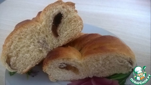 Скрутить полости в виде спиралей, соединить в кольцо. Сформованные булочки выложить на противень, застланный пекарской бумагой, поставить на на расстойку на 20-30 мин. Далее булочки смазать взбитым яйцом и отправить в разогретую духовку для выпекания, выпекать при t=180-190°С. Хочу обратить внимание, что температурный режим и время выпекания каждый выбирает самостоятельно, ориентируясь на возможности своей духовки.