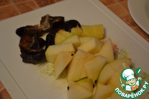 Из фиников вынуть косточку, имбирь очистить. Нарезать грушу, имбирь и финики.