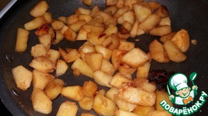 • Яблоки и айву почистить, нарезать кубиками. Сложить в сковороду с непригораемым дном, добавить воду, сахар и специи.