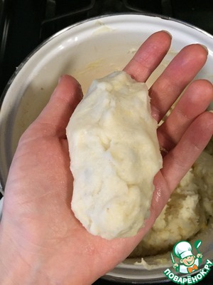 В остывшее картофельное пюре добавляем яйцо, муку и 3-4 горсти тертого сыра и хорошо перемешиваем. Получается слегка липкое тесто.