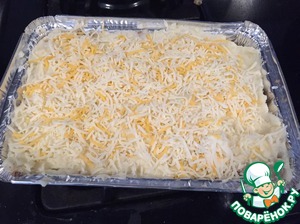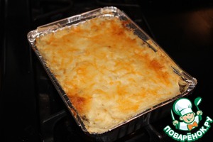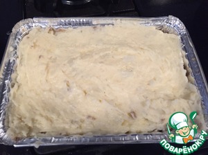Сверху него начинку из печени и накрыть оставшимся картофельным тестом