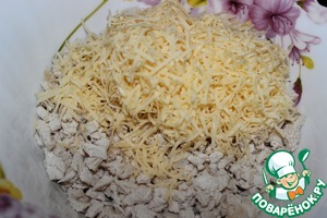 Сыр натереть на мелкой терке. Затем добавить к курице натертый сыр и яйцо.