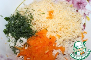 Болгарский перец, натертый на крупной терке, и нарезанную зелень добавить к курице.