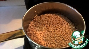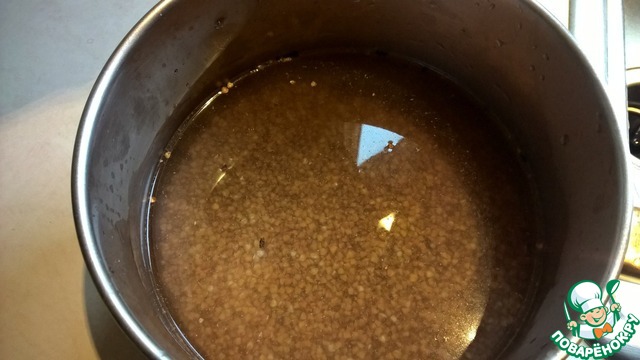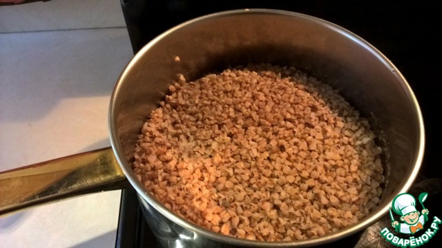 Крупу высыпьте в сотейник с толстым дном (диаметром сантиметров 20), залейте водой из-под крана и хорошо перемешайте рукой. При этом всплывет вся оставшаяся в крупе шелуха и пустоцветы. Все это надо сверху слить. Крупа должна остаться в сотейнике без воды.
