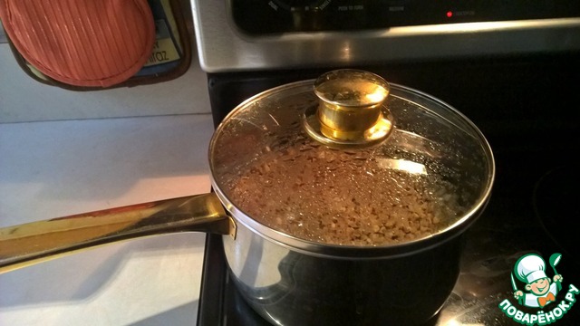 ПОСЛЕ этого заливаем водой в соотношении на 1.5 стаканов гречки - 4 стакана воды. Доводим до кипения на сильном огне и переведя на малый огонь, под плотно закрытой крышкой томим 1 час 15 минут (время в вашем случае может отличаться из-за разности в посуде и плите). После этого каша получается воздушно-рассыпчатой и мягкой. Мне и моей семье такая нравится, но я допускаю, что вам нравится более жесткая каша - дело вкуса.