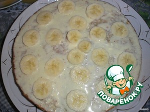 Уложить пропитанную 1 часть, смазать кремом, выложить половину нарезанного кружочками банана,