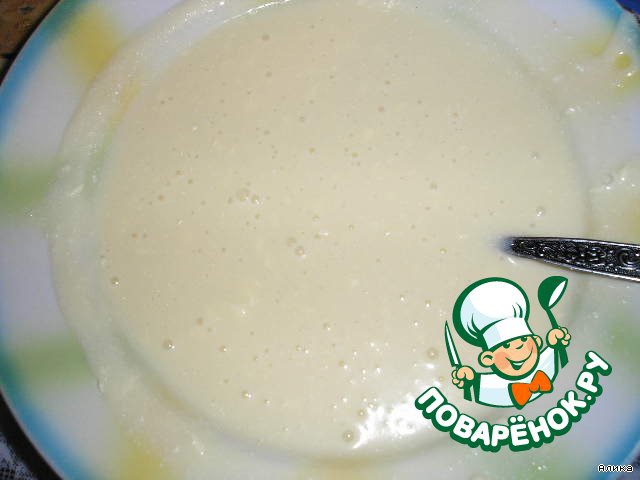 Постепенно добавить муку, замесить тесто. Разделить тесто на 2 части и испечь 2 коржа.
