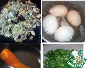 Подготовьте все необходимые ингредиенты. Морковь отварите до мягкости, яйца сварите вкрутую. Шампиньоны порежьте небольшими кусочками и обжарьте на растительном масле. Лук мелко порежьте.