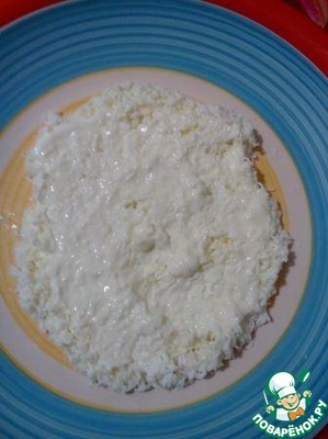 Очистите яйца, отделите белки от желтков. Белки натрите на мелкой терке и выложите на плоское блюдо первым слоем. Сверху покройте тонким слоем майонеза.