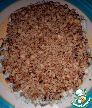 Орехи измельчите в блендере или просто порубите ножом. Выложите орехи вторым слоем. Сверху - тонкий слой майонеза.
