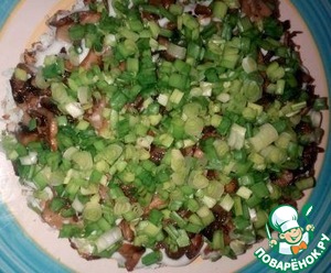 Посыпьте грибы мелко порезанным зеленым луком и снова тонкий слой майонеза.
