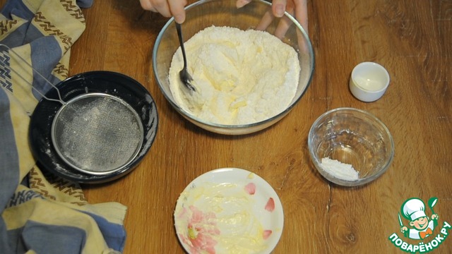 В глубокой миске смешать муку, сахарную пудру, яичный желток, и сливочное масло комнатной температуры. Замесить тесто. Завернуть его в пленку и убрать в холодильник на 20 минут. |