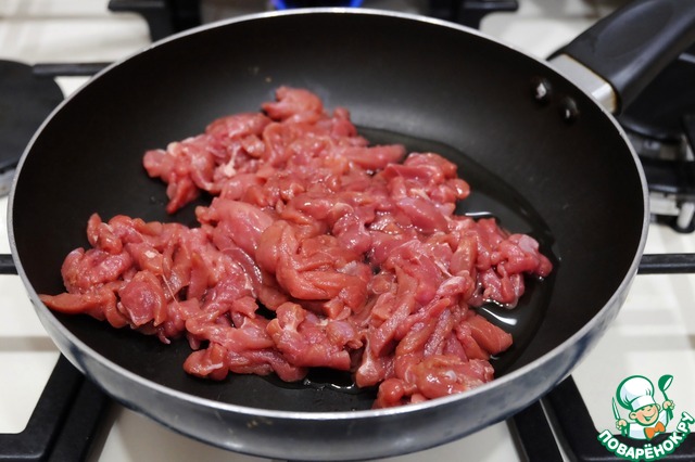 В сковороду добавить 3 ст. ложки растительного масла, добавить филе утки, нарезанное соломкой, тушить на медленном огне до готовности. В конце тушения добавить соль и черный молотый перец по вкусу.