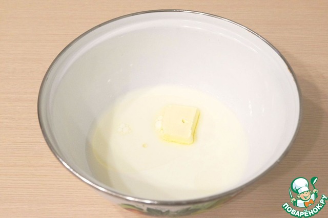 Смесь поставить на медленный огонь, нагреть до полного растворения сахара и сливочного масла. В теплую молочно-масляную смесь добавить 7 гр. гранулированных дрожжей. Емкость оставить для роспуска дрожжей.