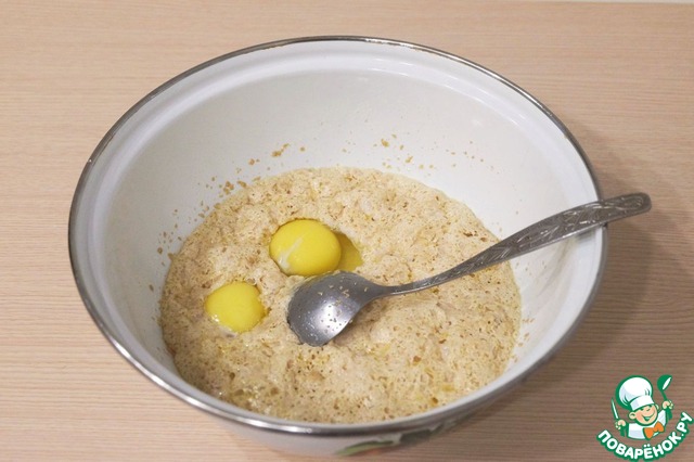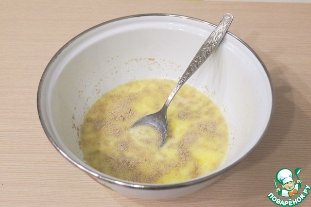 Затем добавить в дрожжевую смесь яйцо (1 шт.) и яичный желток (1 шт.). Смесь взбить вилочкой или венчиком.