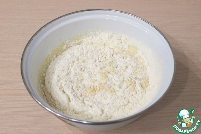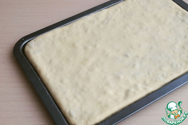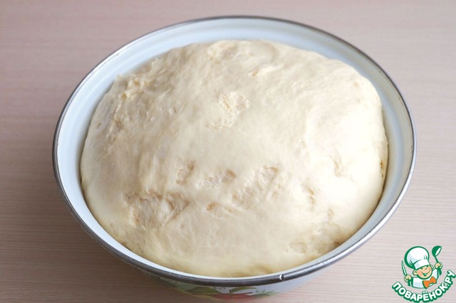 Добавить в подготовленную смесь соль (1 ч. ложка) и всю порцию муки (3 стакана). Заместить тесто. Емкость с тестом накрыть полотенцем или пищевой пленкой и поставить в теплое место для подъема.