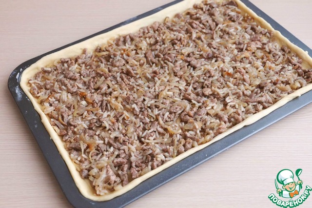 Тесто разделить на две части. Одну часть теста раскатать в пласт толщиной 4-5 мм. Перенести пласт теста в форму для выпекания или противень, смазанный растительным маслом, выложить начинку из мяса утки, лука и риса. Разровнять.