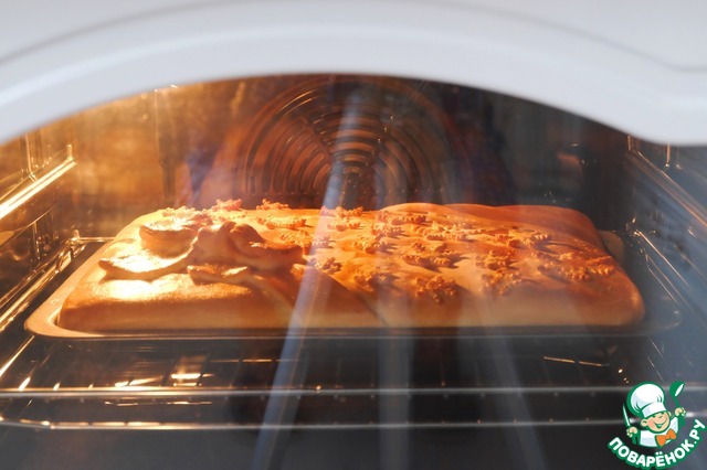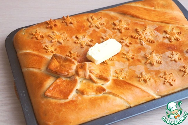 Готовый горячий пирог смазать сливочным маслом для смягчения верхней корочки.