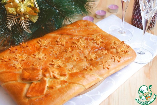Раскатать вторую часть теста, перенести пласт теста на начинку. Подвернуть боковую часть в центру. Разровнять. Украсить пирог по вкусу. Сделать проколы на поверхности пирога во избежание разрывов при выпекании и для выхода пара. Пирог поставить на расстойку на 10-15 мин.