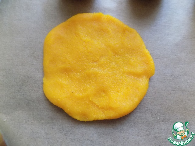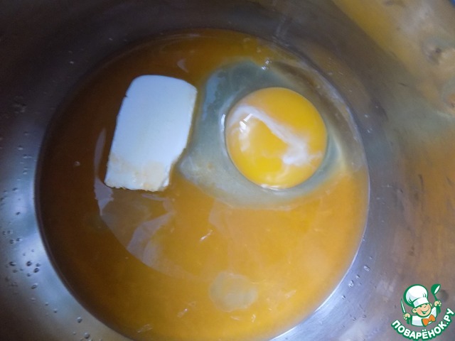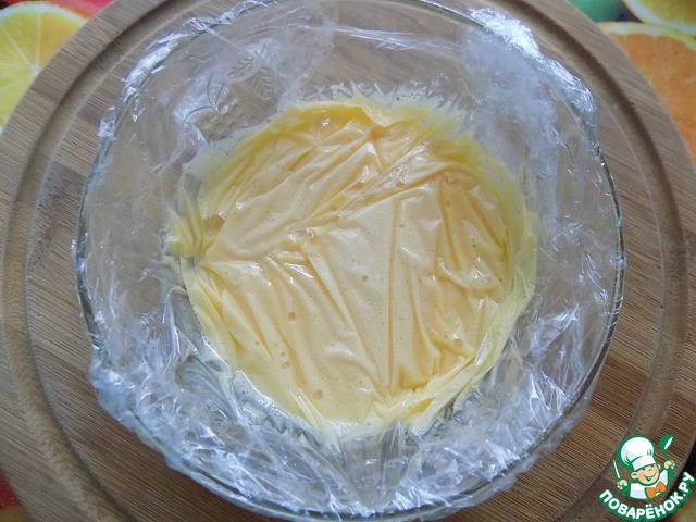 Заворачиваем тесто в пищевую пленку и готовим начинку. Я сделала мандариновый курд и смешала с измельченным печеньем. Для приготовления курда смешать мандариновый сок, яйцо, сахар, по желанию добавить цедру, положить масло и поставить на маленький огонь (можно на водяную баню).