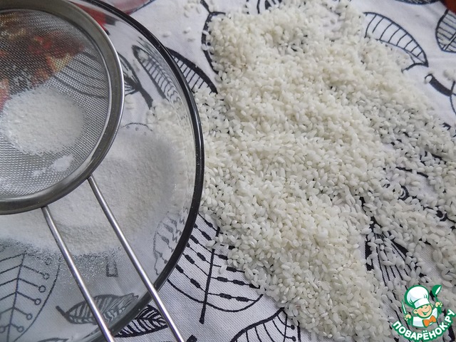 Перемолоть рис в кофемолке небольшими порциями и просеять. Оставшиеся после просеивания крупные частички снова перемолоть. Муки понадобится 100 г, поэтому изначально можно замочить бОльшее количество риса, т. к. остается некоторое количество крупных частиц даже после повторного перемалывания.