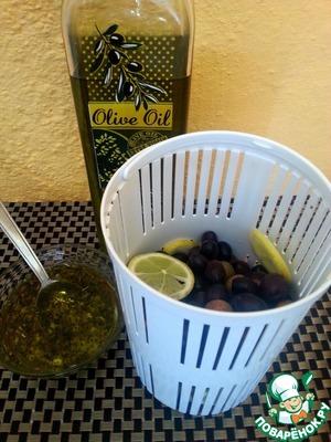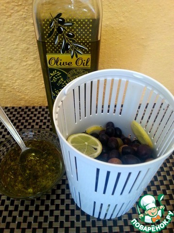 Плотно закладываем оливки в банку (или специальный контейнер) вместе с нарезанным лимоном. Оливковое масло смешиваем со специями (мята, тимьян) и измельченным чесноком.