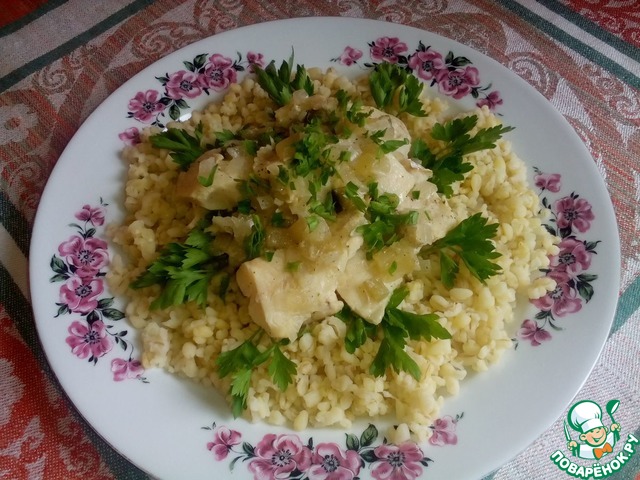 Подаем с вареной картошечкой, полив соусом и посыпав зеленью.