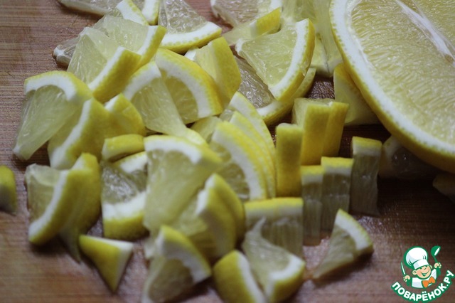 Оставшиеся ПЯТЬ лимонов вместе с кожурой нарезаем на мелкие кусочки.